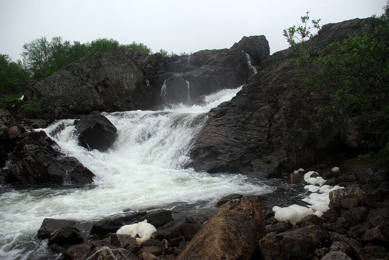 Поставил палатку, распаковался, поужинал. Неспеша пошёл прогуляться вокруг. На самом деле там не один водопад, а целый каскад из нескольких водопадов, очень красивых. Ниже часть потока рассыпается сотнями струек по огромному каменному выступу, а сама река шумит через тысячи камней. Жаль, с освещением не повезло - было пасмурно, поэтому фотографии получились не очень. На другом берегу - высоченная скала, вершина которой скрывалась в облаках. Есть своя прелесть и в такой погоде - водопад показывает всё суровое величие северной реки.